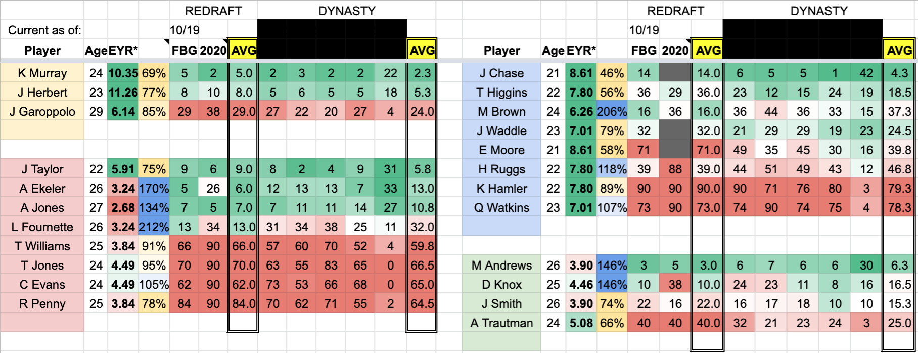 Overall, I would have been better off putting in more effort to diversify *OR* putting in less effort to diversify as my half-measures gave me the worst of all worlds. But that’s outcome-centric thinking. I really should have pushed harder to move Akers and I really shouldn’t have put so many eggs into Tee Higgins’ basket, but diversifying McLaurin and Aiyuk was the correct call, even with hindsight. (We can see now the danger of judging things too quickly, too, as Shenault is poised to overtake Aiyuk in value once again.)