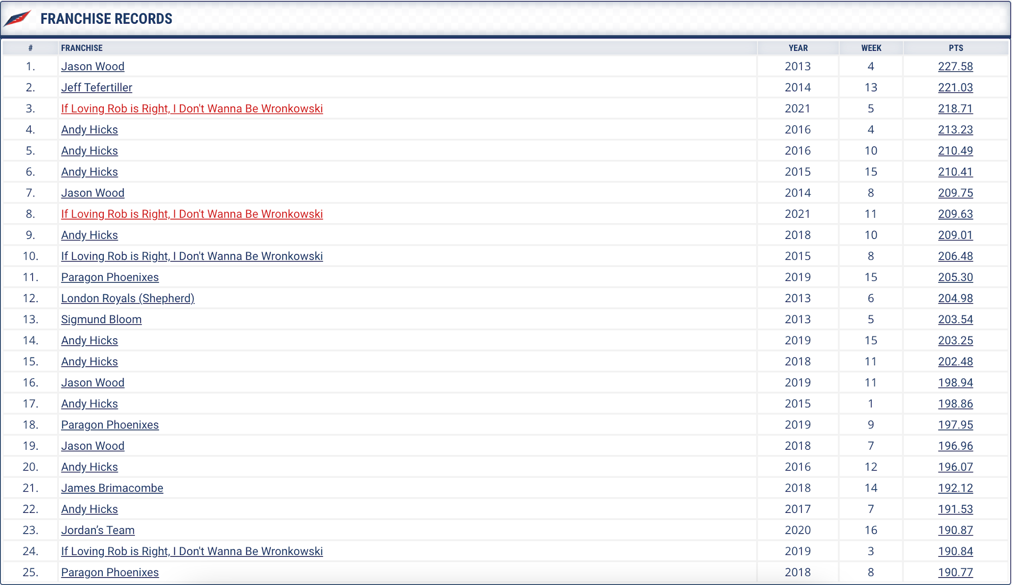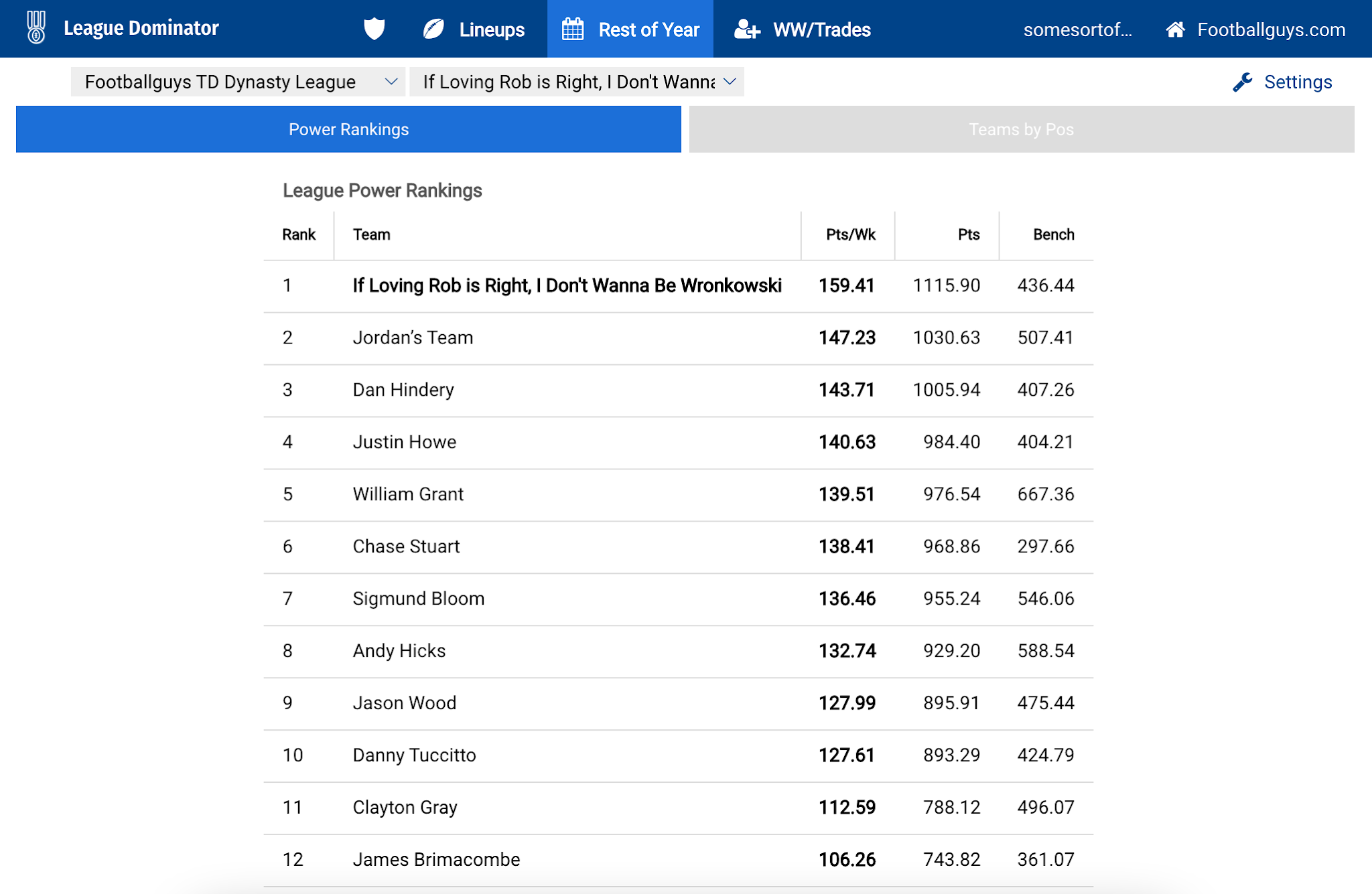 (Dan Hindery finished last year with the #3 draft position; he’s currently 6-0, 1st in points scored, and 4th in projected points going forward. Demonstrating again that a rebuild can be accomplished in a single season.)