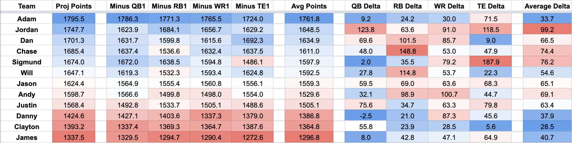 Moreover, not only is my team good, it is deep and robust. Here’s projected points scored by every team should they happen to lose their QB1, RB1, WR1, or TE1 to injury tomorrow. Because of my depth, tight end Mark Andrews is the only player whose injury or underperformance would meaningfully impact my bottom line. (Meanwhile, my top competitors are much more exposed to risk.)