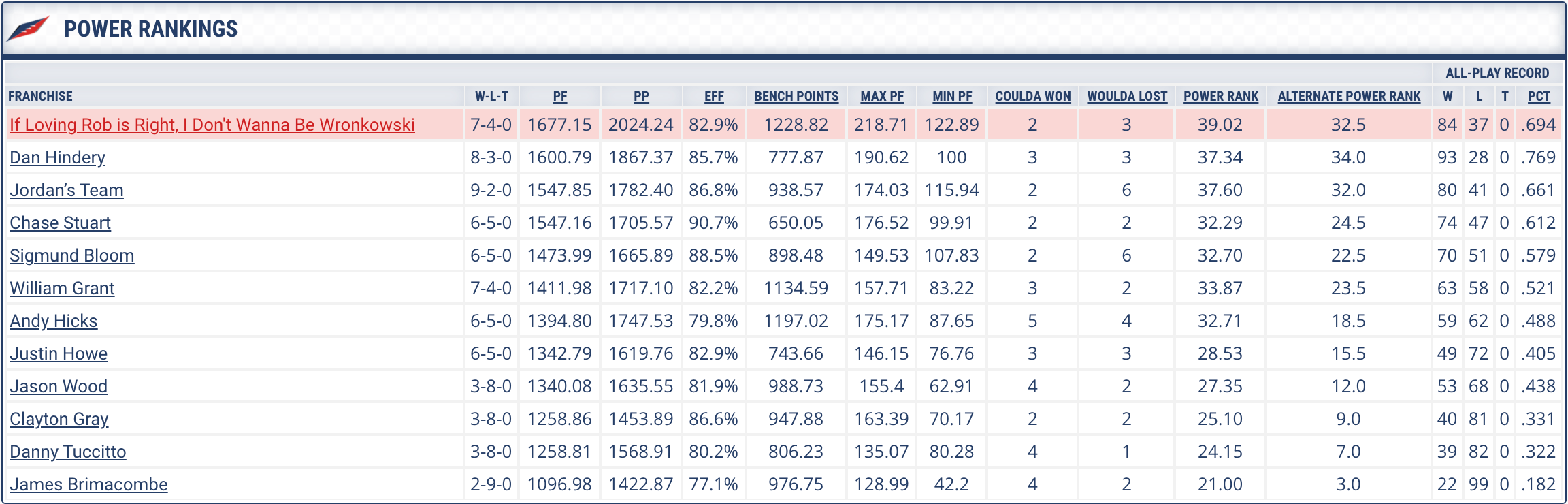 #1 seed, 157.3 points per game average (league average: 127.0; 2nd-place: 142.4). Among non-QBs, I have the #2, #3, #4, #10, #15, #26, #33, #39, and #41 overall scorers (plus the #3 and #10 QBs).