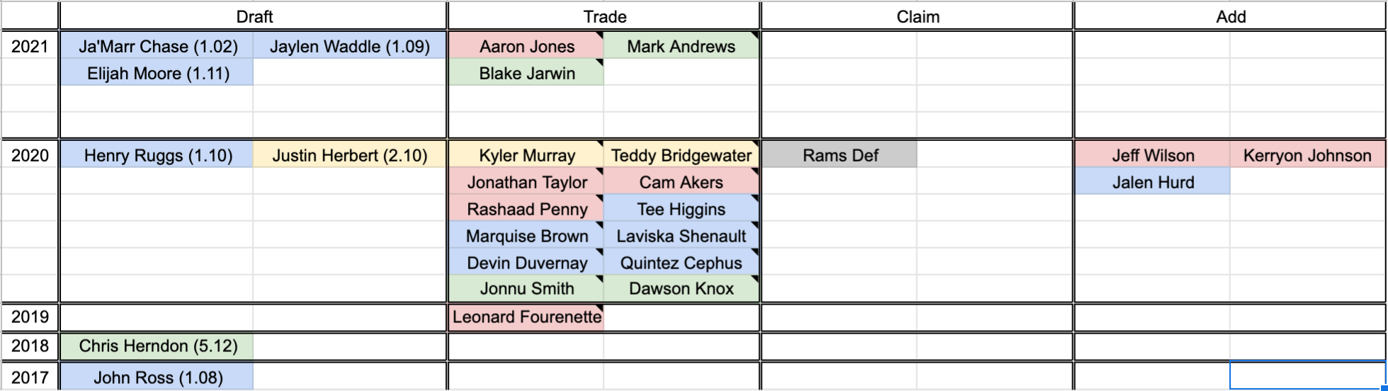 Of the 26 skill players (I also have the Rams defense, but they don’t count), only six are holdovers. Two of those (Ross and Hurd) only survived because they were able to hang out on IR and therefore didn’t cost a roster spot. Another two (Ruggs and Herbert) were my top two rookie picks last year. Finally, Herndon and Fournette were low-value players whose talent I liked more than their cost where I decided to gamble on things breaking right for them and their value going up. Fournette played well but re-signed in Tampa. Herndon did not play well, but with a rookie QB and a non-Gase head coach he gets one last chance to make some noise.