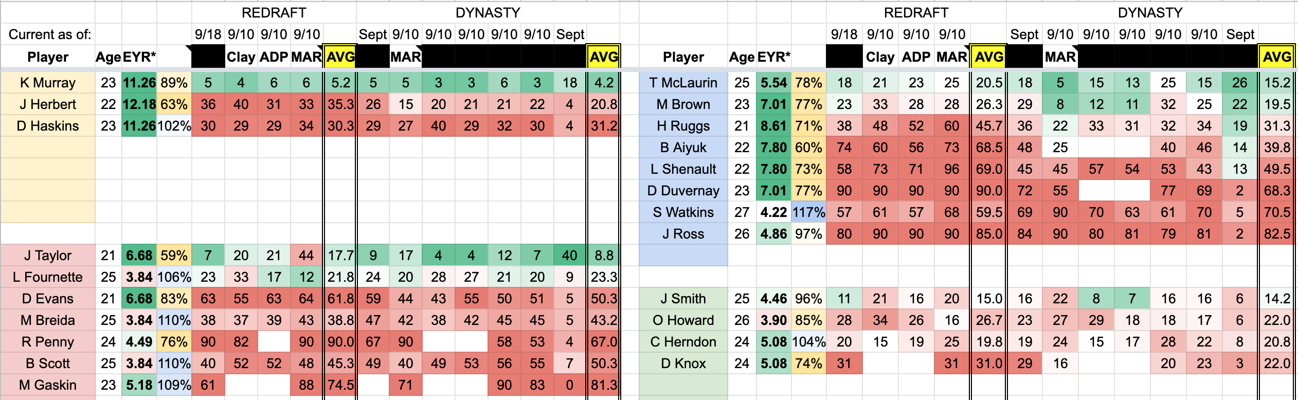 EYRs are suddenly green for everyone except Fournette, Breida (who was subsequently cut), Scott, Watkins, and Howard (who I think is currently undervalued in dynasty, so I’m holding and hoping for a value spike at some point before selling). Nearly everyone is yellow, which means valued higher in dynasty than in redraft and likely to retain their value.