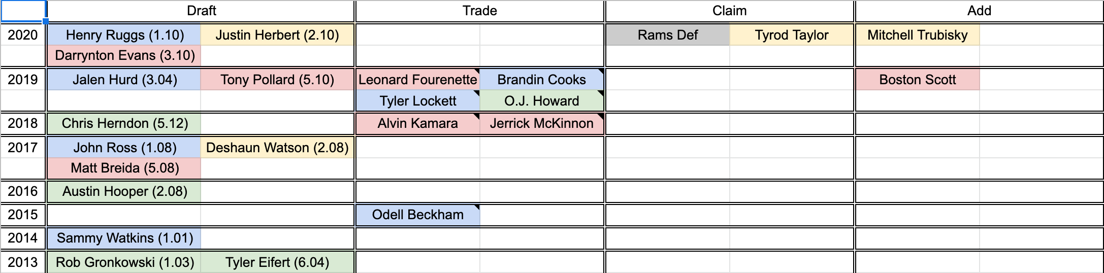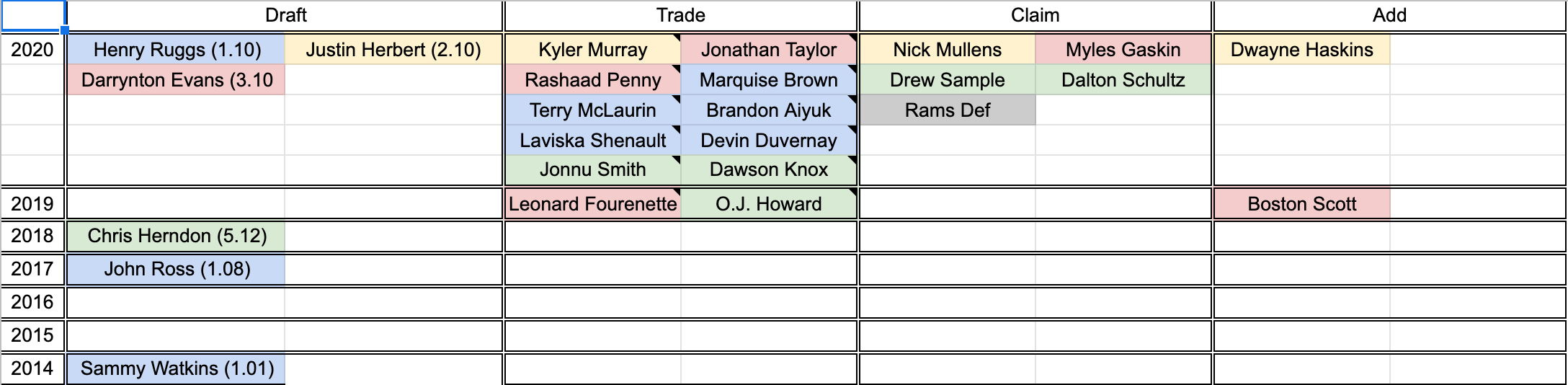 Beyond specific trade targets highlighted by my formula, I wanted to load up on as many “low-risk” assets as I could. By low-risk assets, I specifically mean future 1st round picks and rookie receivers. History tells us that these assets are extraordinarily unlikely to lose value in the next year, which is important because my team is not going to be winning much and I don’t want to bleed trade value while I do it. I like Aiyuk and Shenault, but largely I view them as replaceable with a bunch of other similar receivers (Tee Higgins, Michael Pittman Jr., Chase Claypool, Darius Slayton, Denzel Mims, etc.)